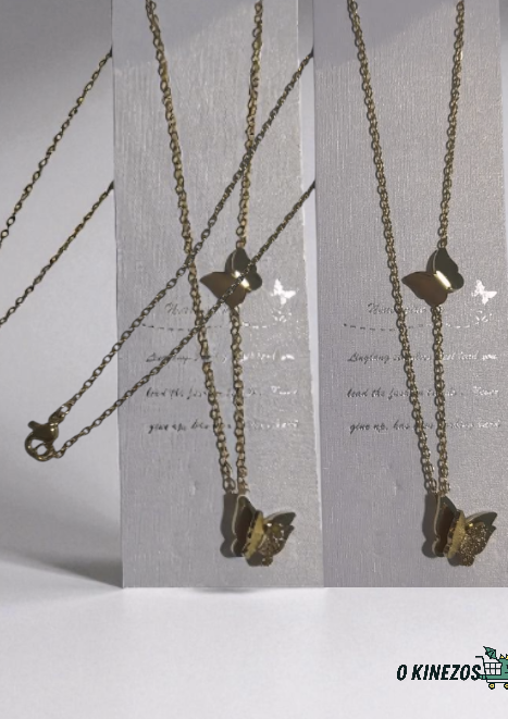 Κολιέ με μοναδικό σχέδιο πεταλούδας κατασκευασμένο από ανθεκτικό ανοξείδωτο ατσάλι σε χρυσό χρώμα που χαρίζει λαμπερή και κομψή εμφάνιση ιδανικό για καθημερινή χρήση αλλά και για ξεχωριστές εμφανίσεις συνδυάζεται εύκολα με άλλα κοσμήματα και δίνει μία διακριτική και ρομαντική πινελιά σε κάθε στυλ κατάλληλο για όσους αναζητούν ένα διαχρονικό κόσμημα με ανθεκτικότητα και κομψότητα